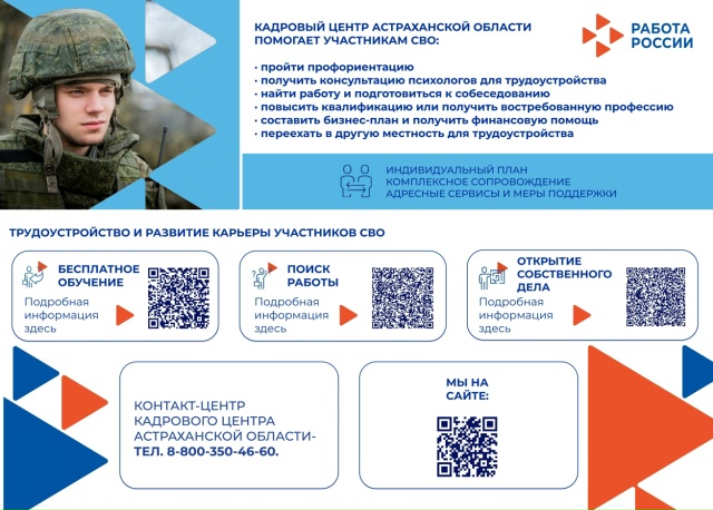Участникам СВО доступно бесплатное профессиональное обучение и программы переподготовки. Подробная информация размещена по ссылке: https://trudvsem.ru/information-pages/support-employment.Актуальные вакансии можно найти на портале: https://trudvsem.ru/vacancy/search?_regionIds=3000000000000.Информация о мерах поддержки для начинающих предпринимателей размещена на сайте https://azn.astrobl.ru/grazdanam/uslugi-predostavliaemye-grazdanam/sodeistvie-nacalu-osushhestvlenii...Получить консультацию можно по телефону контакт-центра Кадрового центра Астраханской области: 8-800-350-46-60.